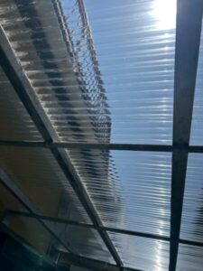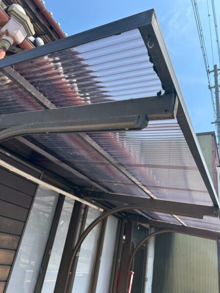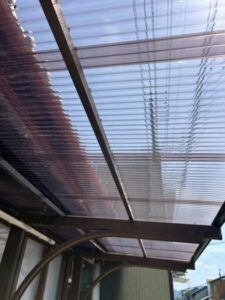 現地で確認させていただいたところ、劣化で割れており、一部剥がれてなくなっているところもありましたので、新しいポリカーボネートに全交換させていたただきました。