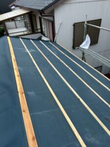 棟板金の下には「貫板」と呼ばれるものを設置して、しっかりと固定できるようにしています。