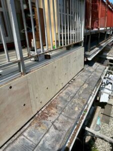 ベランダの床が激しくきしむとのことでベランダの土台部分に木枠をつけ、周りをべニアと板金で囲わせていただきました。
