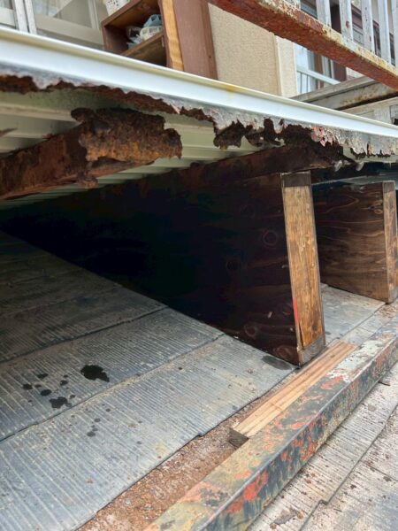 ベランダの下には金属製の格子の枠がはめ込まれ、ベランダの床を支えていましたが、この枠が錆びてボロボロになっていました。